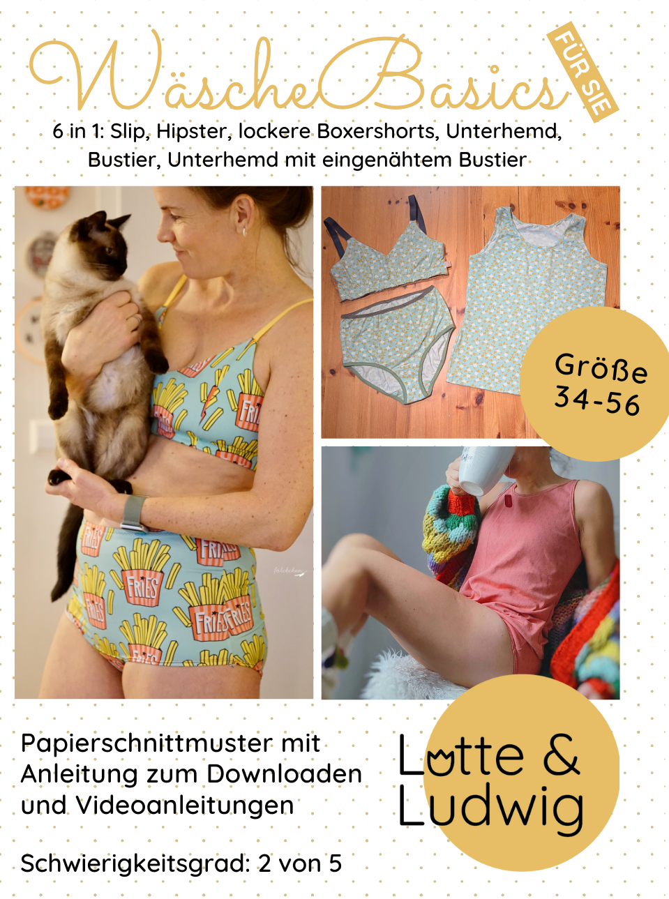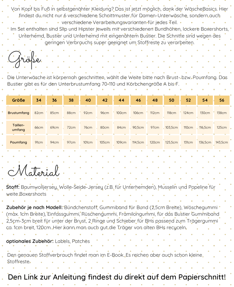 Im Set enthalten sind Slip, Hipster, enge und weite Boxershorts, Unterhemd und Bustier. Die Schnitte sind wegen des geringen Verbrauchs super geeignet um Stoffreste zu verarbeiten.